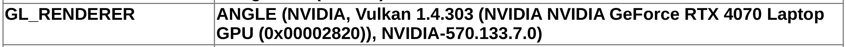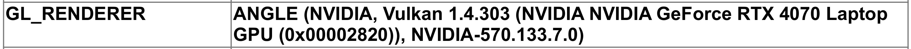 GL_RENDERERis my blazing-fast NVIDIA GeForce RTX 4070. Sweet! (Interestingly, the Canvas and WebGL2 features now say that they are Hardware accelerated but at reduced performance; my understanding is that this is because we disabled Vulkan's surface implementation.)