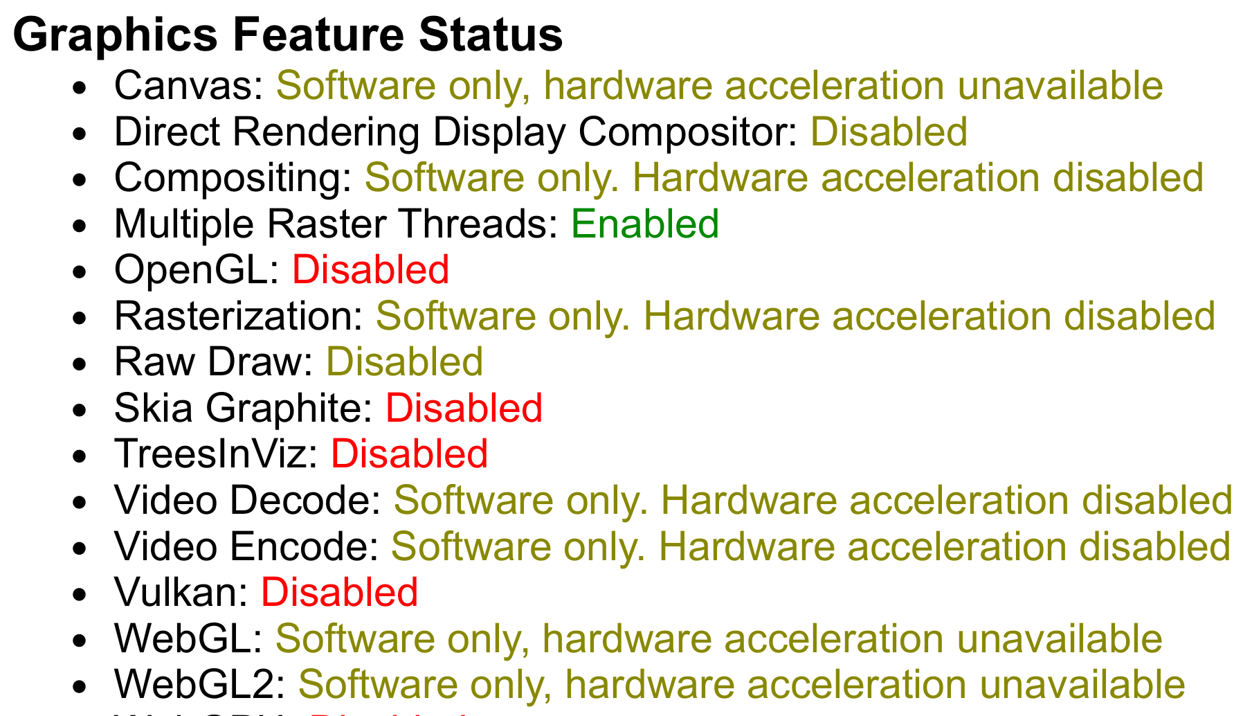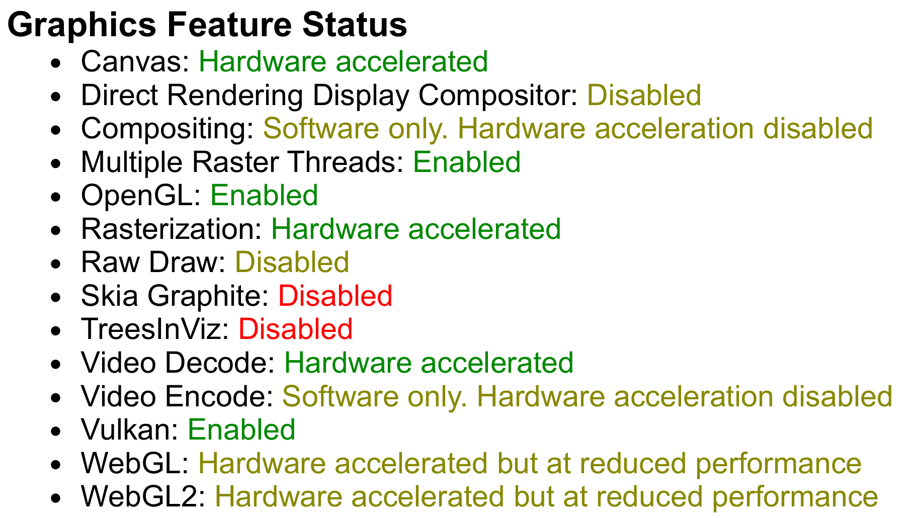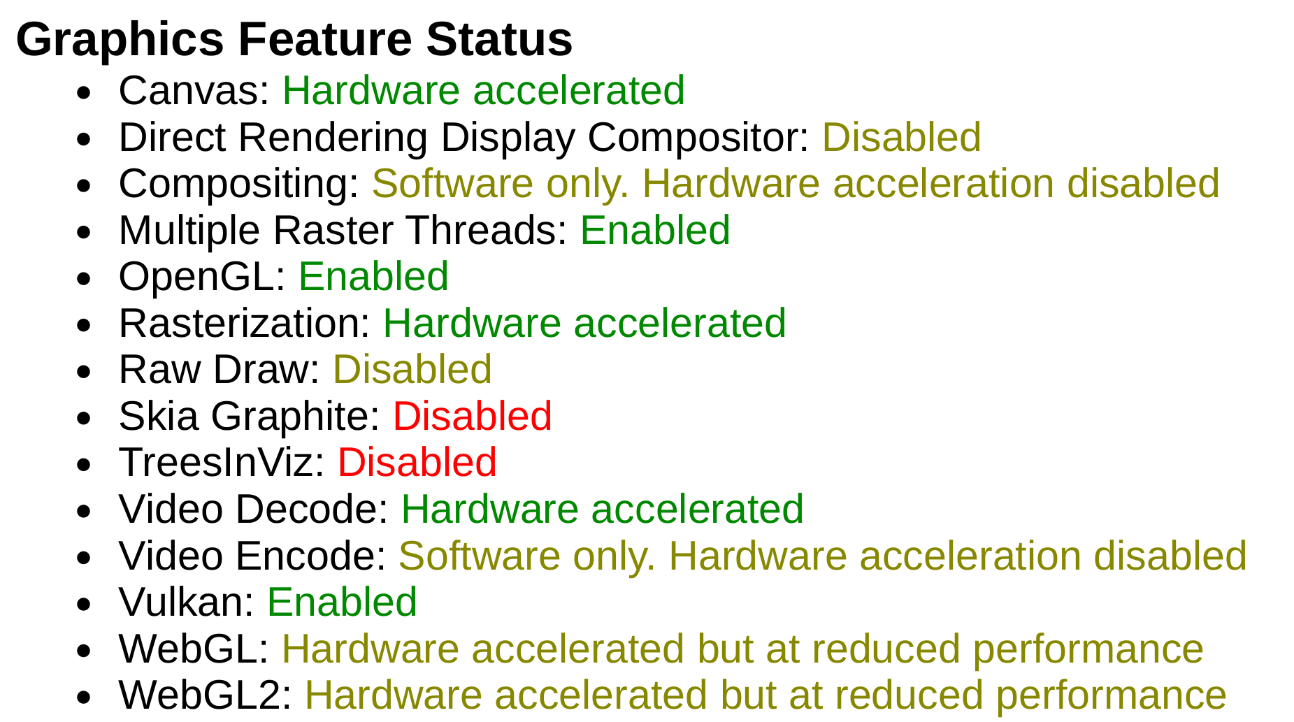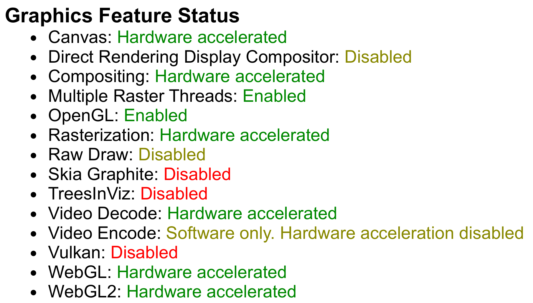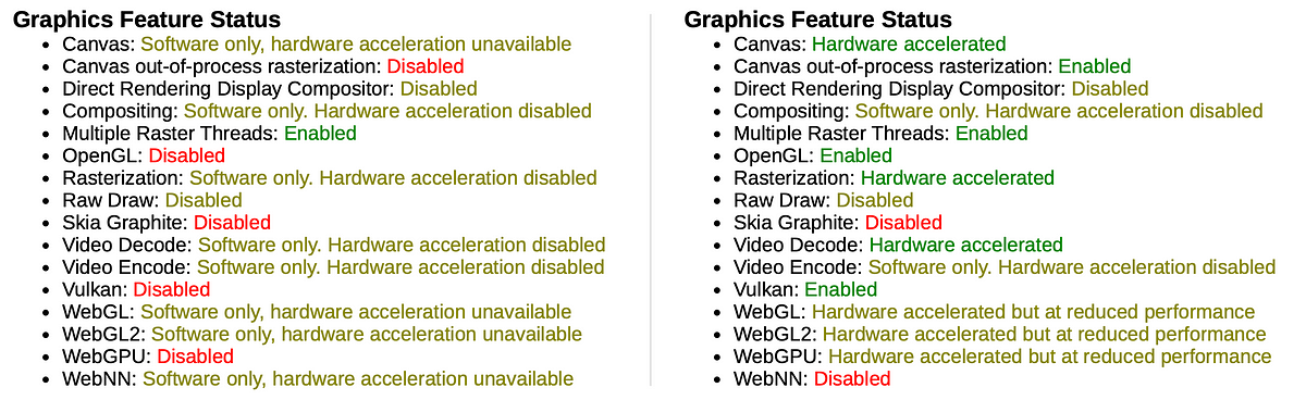 GL_RENDERERis set to SwiftShader, Google's CPU-based fallback implementation of the Vulkan API. - When we enable WebGL and the GPU, the Canvas and WebGL2 features now report Hardware accelerated. Nice! However, Vulkan is Disabled. Taking a look at