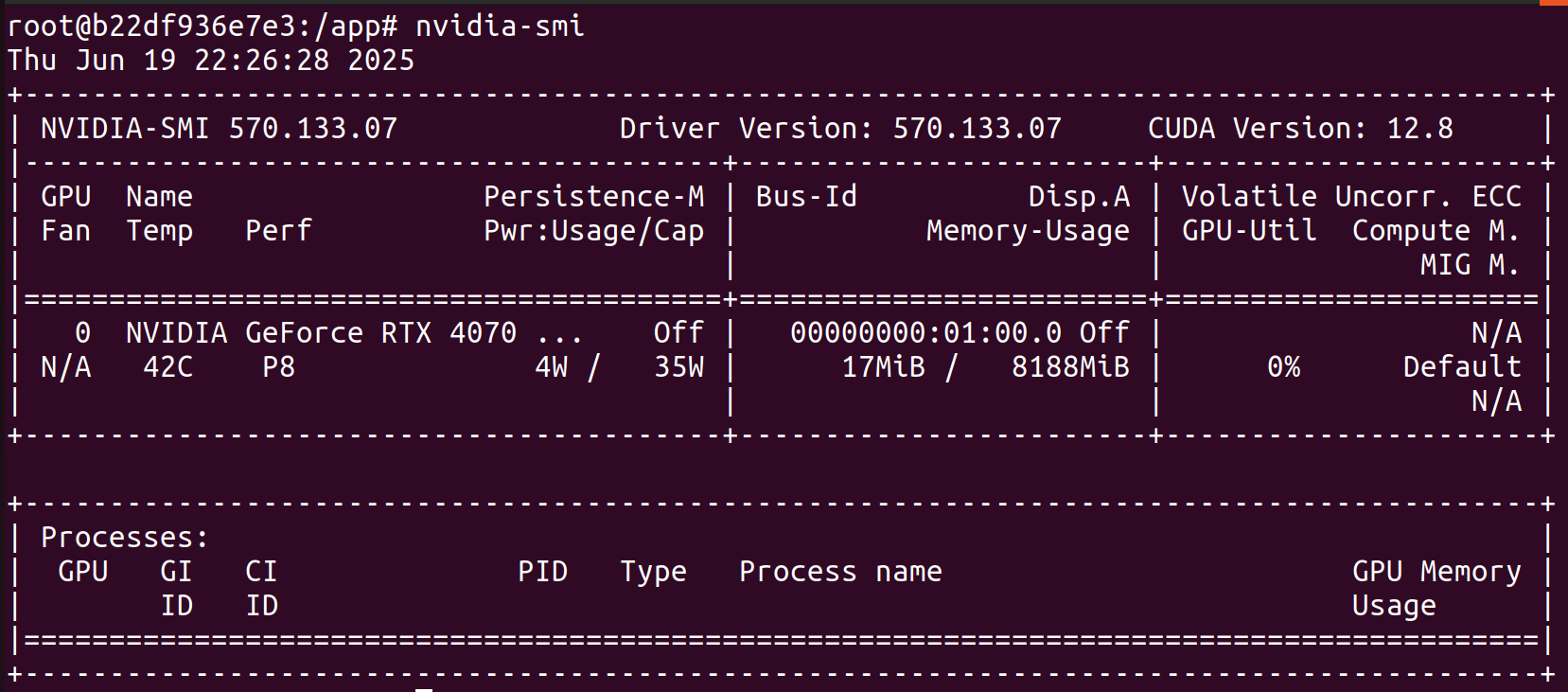 We can run this Dockerfile with docker run -it --rm --gpus all playwright-sandbox /bin/bash, and then we run nvidia-smi in the shell to confirm our GPU is exposed to the container: