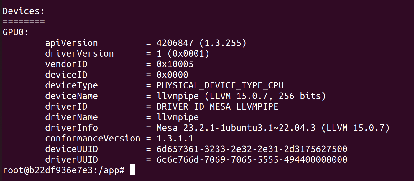 Now we re-build the Docker container and re-run vulkaninfo – summary: