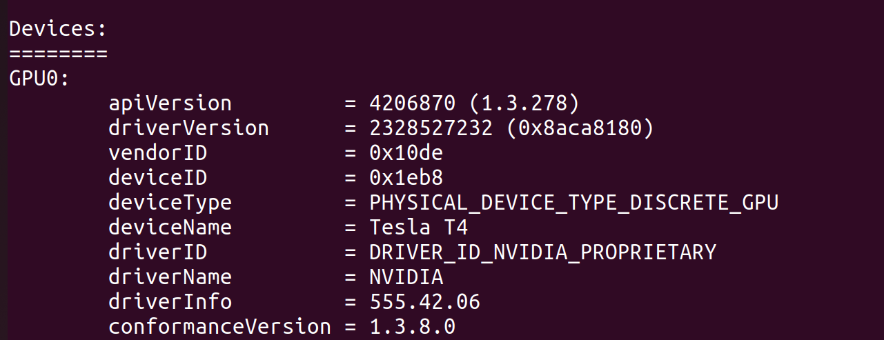 Once we installed the correct driver version, the Vulkan initialization error was resolved. We used Kubernetes to exec into the pod in question and confirm our GPU was being discovered with vulkaninfo --summary: