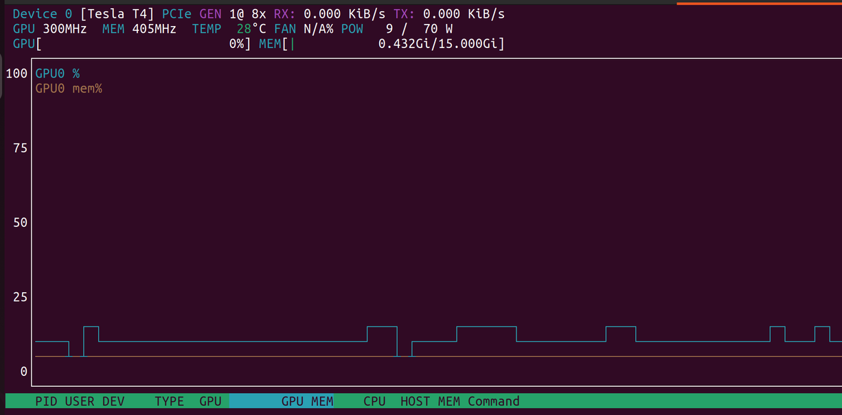 vulkaninfo --summary finding the Tesla T4 GPU inside of a g4dn.xlarge EC2 instance.Woohoo! That was a lot, but it's done: a Docker container, in the cloud, capable of running a hardware accelerated headless browser. At long last we could run a render with nvtop open see that sweet, sweet GPU usage start to rise: