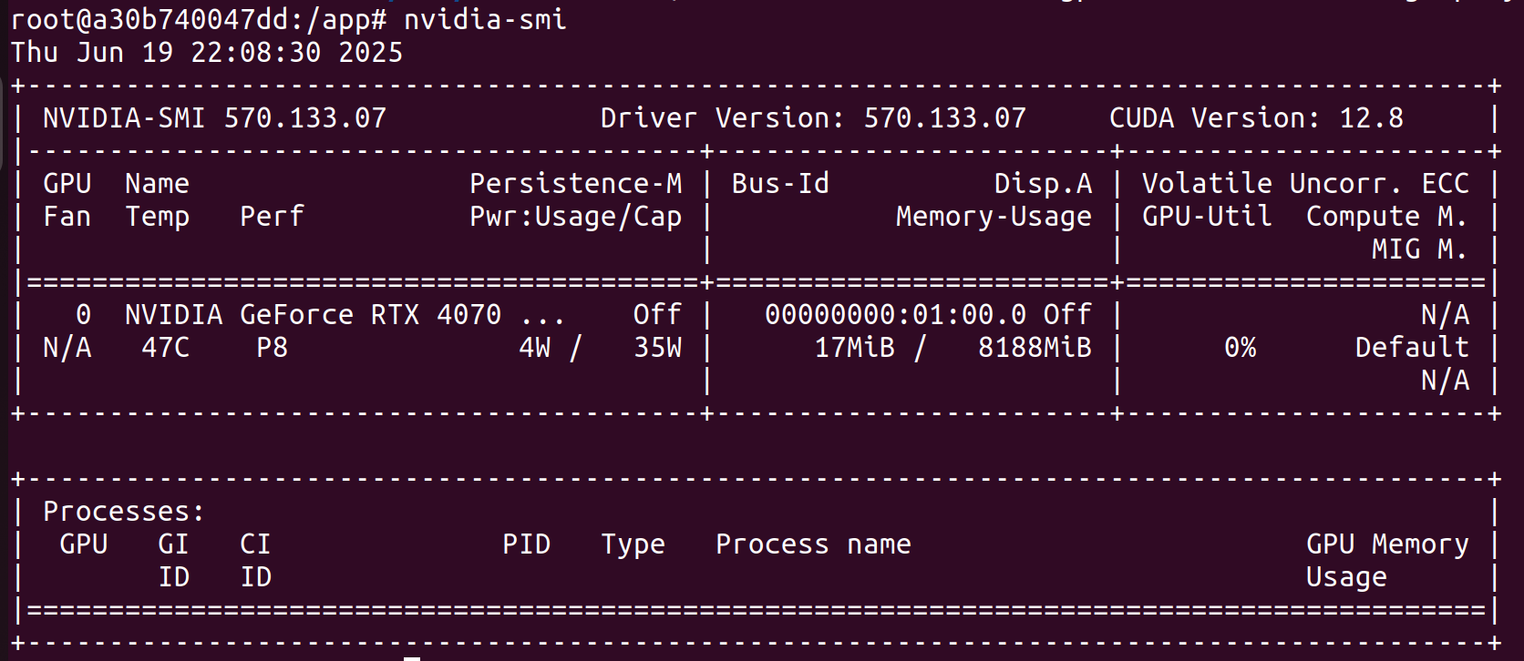 Exposing an NVIDIA device to a Docker container is pretty straightforward with the NVIDIA Container Toolkit, which has a detailed Installation Guide. Running nvidia-smi inside our Docker container, we can confirm that it's being accessed.