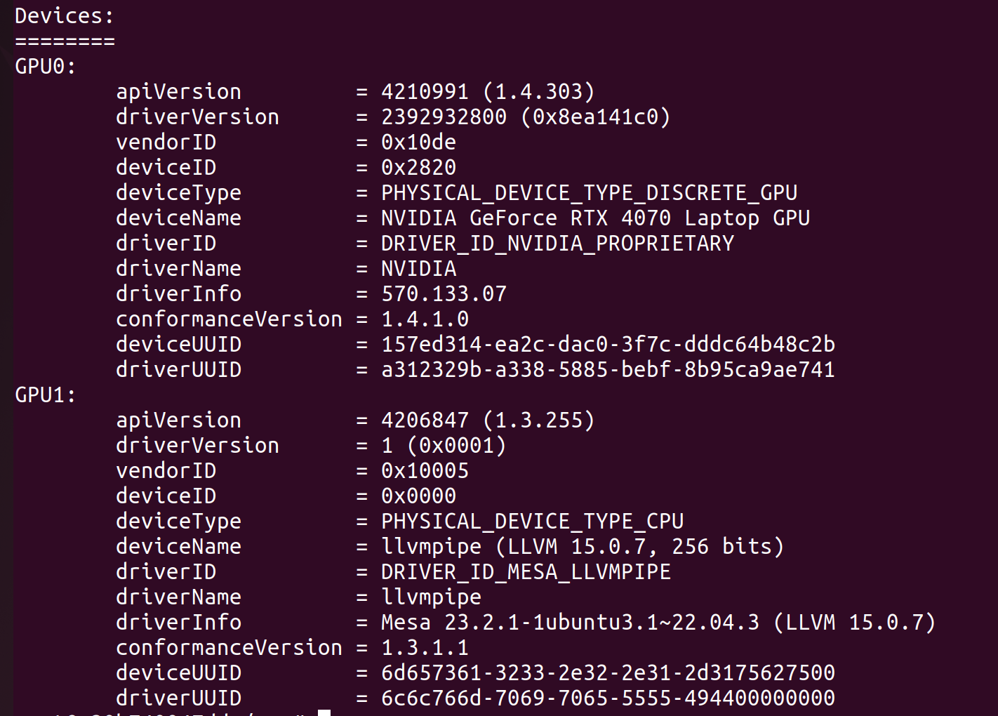 vulkaninfo --summary in our playwright-sandbox container.vulkaninfo lists only a single CPU device called llvmpipe!This is a thorny one but as it turns out, the link between Vulkan and NVIDIA is missing some configuration files. This GitHub repo provides a minimal Docker / Vulkan runtime and helped us trace the missing configuration files down.